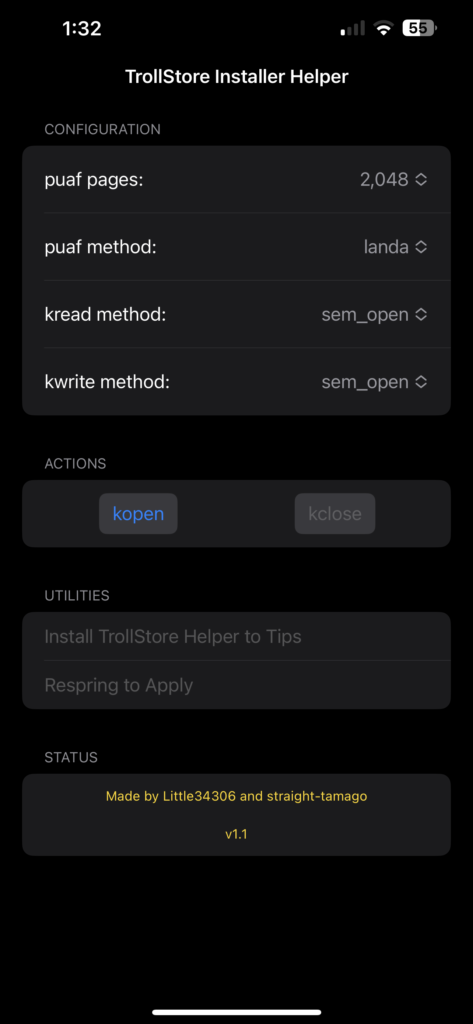 The latest version of TrollStar (1.2) mainly focuses on making cosmetic changes to enhance the user experience. For instance, a mistake in one of the installation pop-ups for TrollStore has been corrected and the “kopen” button has been replaced with a more intuitive “Click here to start!” button to avoid confusion for end users. TrollStar utilizes the combination of the Kernel File Descriptor (kfd) exploit and the puaf_landa technique to perform its functions.
